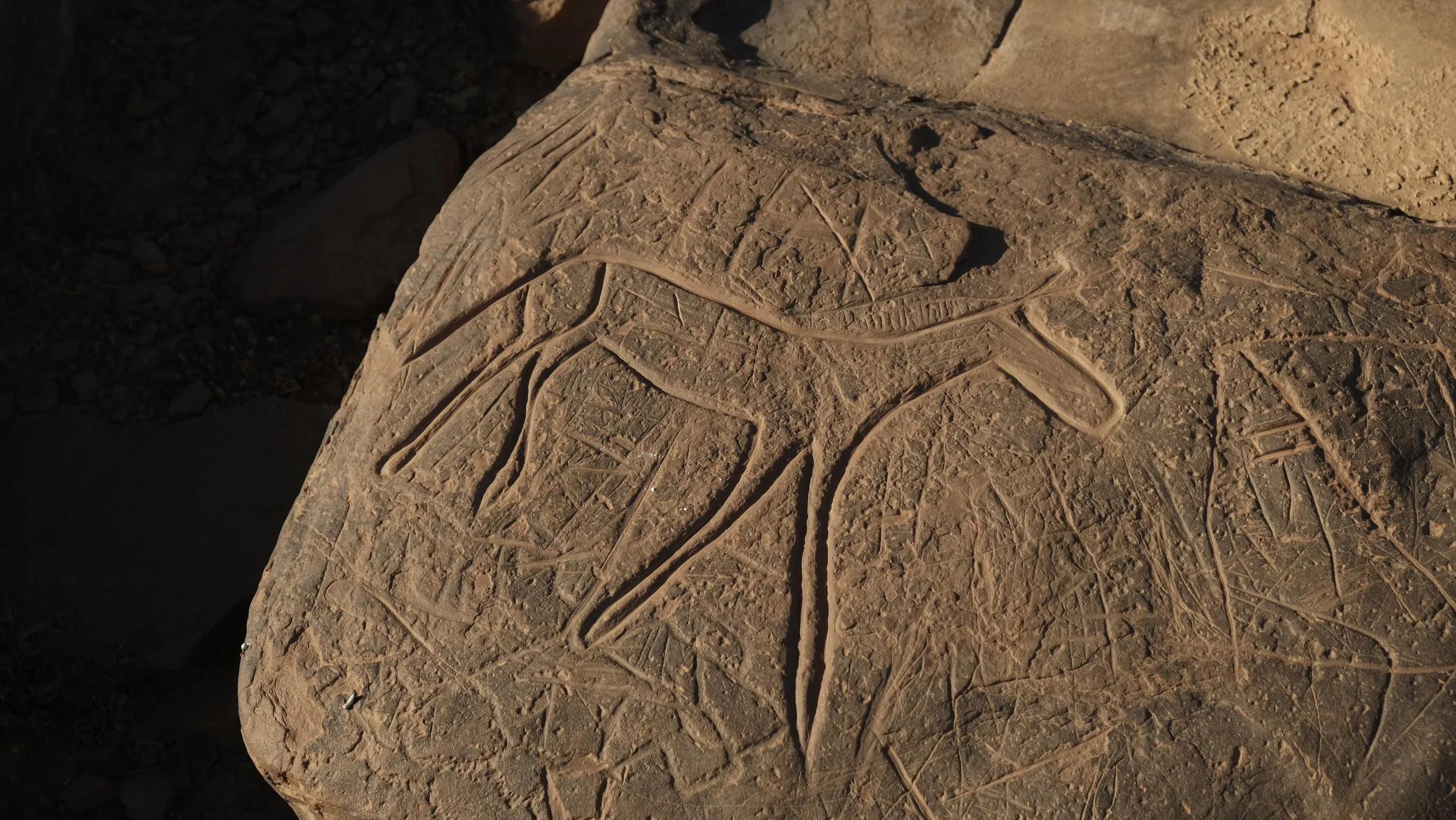 I stop the vehicle at the foot of a small hill, and we finish the path on foot to the top. This one is slightly rounded and covered with a crust of smooth brown rocks, like the surface of an egg cracked at the top. So, with the excitement of those who finally reach their goal after a long quest, we begin to inspect the rocks one by one. And suddenly, in the middle of this ocean of sandstone, like the glow of a campfire which warms the heart when it suddenly appears to the hiker lost in the night, a shape appears before us on a flat stone, which we recognize, instinctively, intimately, being of human origin. Even though they have disappeared for thousands of years, finding a trace of your own in the middle of a foreign world is an extraordinary sensation. It’s like finding the herd again, after having thought you were lost, alone in the middle of the immensity, joy is reborn and with it, life. Little by little, elephants emerge from the stones, gazelles leaping, slender ostriches, charging rhinoceroses, oxen with long horns, which these prehistoric artists represented by observing them parade before them. peacefully in the plain below. I sit in their place and in turn contemplate the rustling and teeming savannah which once stretched out in place of this bleak and bare desert, this great living organism whose flesh has finally dried up and blood has evaporated in the burning sands. My finger follows the curves traced in the stone, like the tip of the sapphire on the grooves of the disc, in search of the message that these men of yesterday tried to engrave there. Who were they? Did they think like us? Did they experience happiness, jealousy, sadness in the same way as us? There are no written documents to bridge the gap of our ignorance and the oral accounts of their history, passed down from generation to generation, have been lost for a long time in the deep crypts of the memory of humanity. But as my finger arrives at the crossing of the legs of a bovid, I then notice the clever process of perspective that the engraver used to make one of the legs pass in front of the other, which, in a fraction of a second cancels the seven thousand years that separate us. Men like me were there, they talked, they ate, they made a fire. One day their children took their place, had children, who themselves had children and so on up to me, what dizziness! A few meters away, Youssef, crouched contemplating a particularly striking drawing of a giraffe, holds on to the rock so as not to lose his balance, while his vain attempts to cling to his scientific detachment are of no help to him.