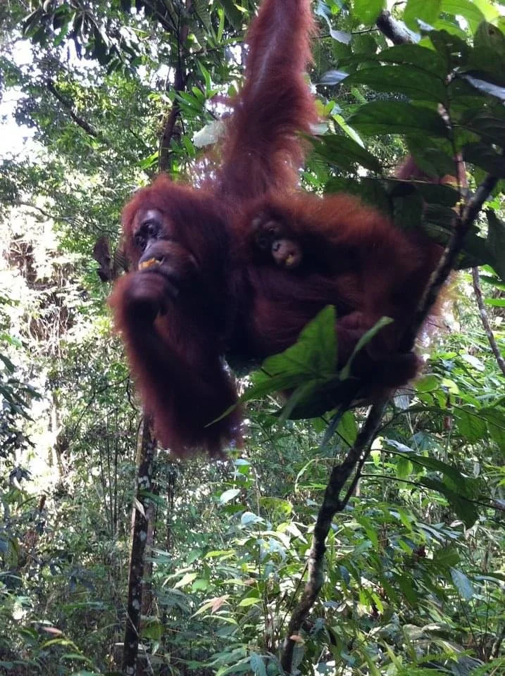 At first nothing happened. No movement, no noise other than that of the arteries beating in my head, amplified by the sharpness of my hearing exacerbated by the adrenaline of anticipation. And then suddenly, somewhere up there in the foliage, a rustling first, like the wave of majesty which precedes the royal person before she enters the room. Something was moving, something we couldn't yet see but whose aura, in the calm of the morning, filled the forest just with its presence. Then finally, like a large migratory bird popping out of the cloud layer to descend towards the earth, we saw an orangutan gently emerging from the leaves. With slow and measured movements, it lowered itself to us without hurrying, in a breathtaking lightness for an animal of this size, as if it was floating in the air, then stopped, suspended two meters above us, where we could observe it clearly and see that it was carrying, clinching to its fur, a baby, staying as far away from us as possible. For a moment, we remained in this distant proximity, like very faraway cousins who see each other for the first time on a station platform, hesitating to take the step of their reunion. Then my guide took out of his backpack a bunch of these small bananas that he had taken with him and handed it to the orangutan who, with majestic slowness and without a glance, unfolded her endless arm to delicately grab it, and establish at this very precise moment, this fabulous connecting point between the world of men and her own. A moment of barely a second but which was instantly removed from the earth's clock, to be sent up there, to the museum of sublime moments, where it will be preserved for eternity. Then, without a sound, without an effort, the orangutan and her baby set off again, in a movement imbued with all the nobility of their species, towards their kingdom of leaves, where they disappeared forever.